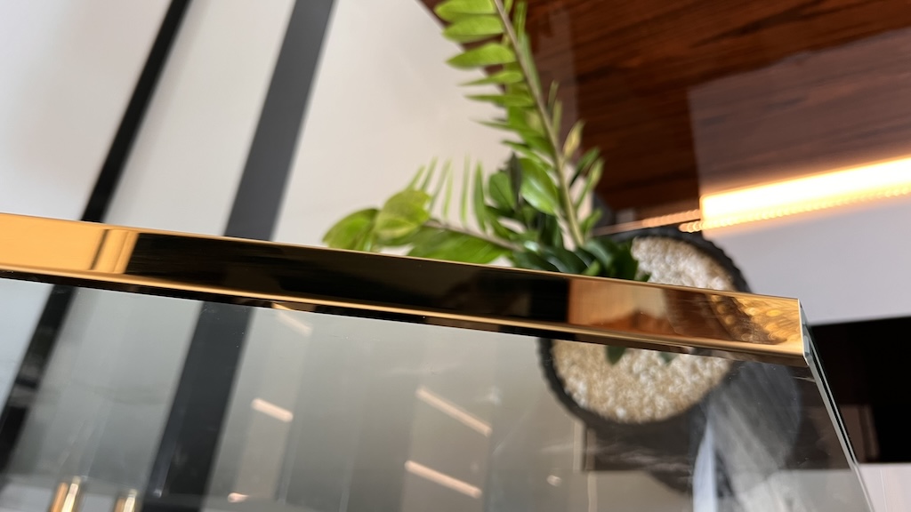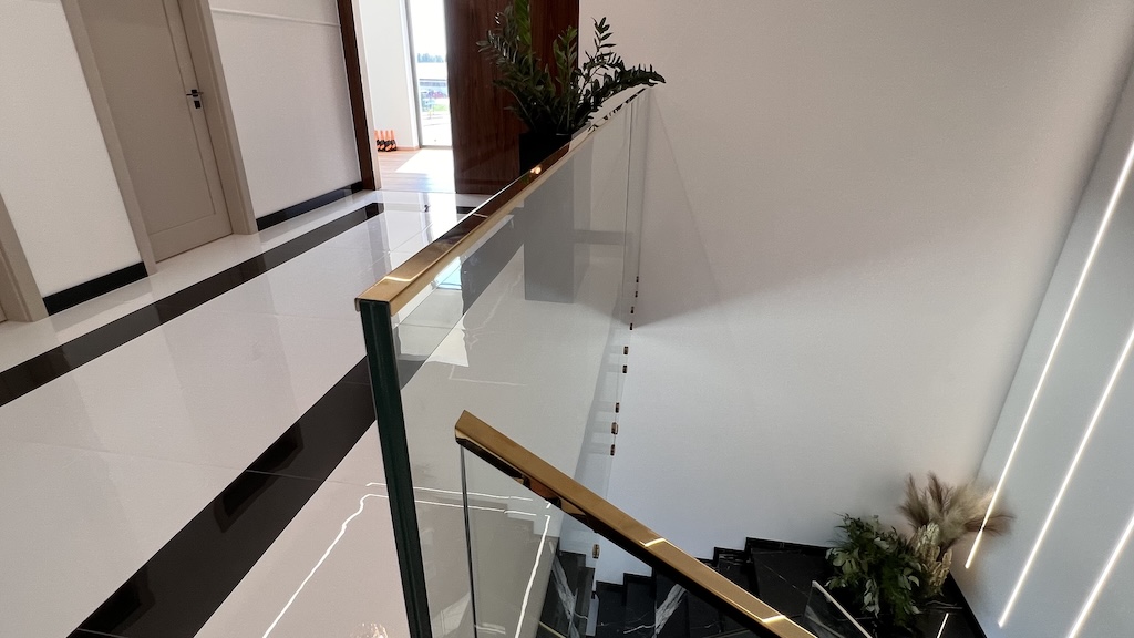 W projekcie zastosowaliśmy system balustrad w mocowaniu punktowym. Okucia punktowe wykonano ze stali nierdzewnej w gatunku 304, a następnie uszlachetniono powłoką platerowaną w odcieniu złota, co zapewnia wysoką odporność na korozję, łatwą pielęgnację oraz spójność z luksusową stylistyką recepcji i stref komunikacyjnych. Każde mocowanie zostało precyzyjnie dobrane do geometrii schodów i układu antresoli, dzięki czemu balustrady szklane zachowują lekkość wizualną, a jednocześnie gwarantują stabilność i bezpieczeństwo użytkowania.