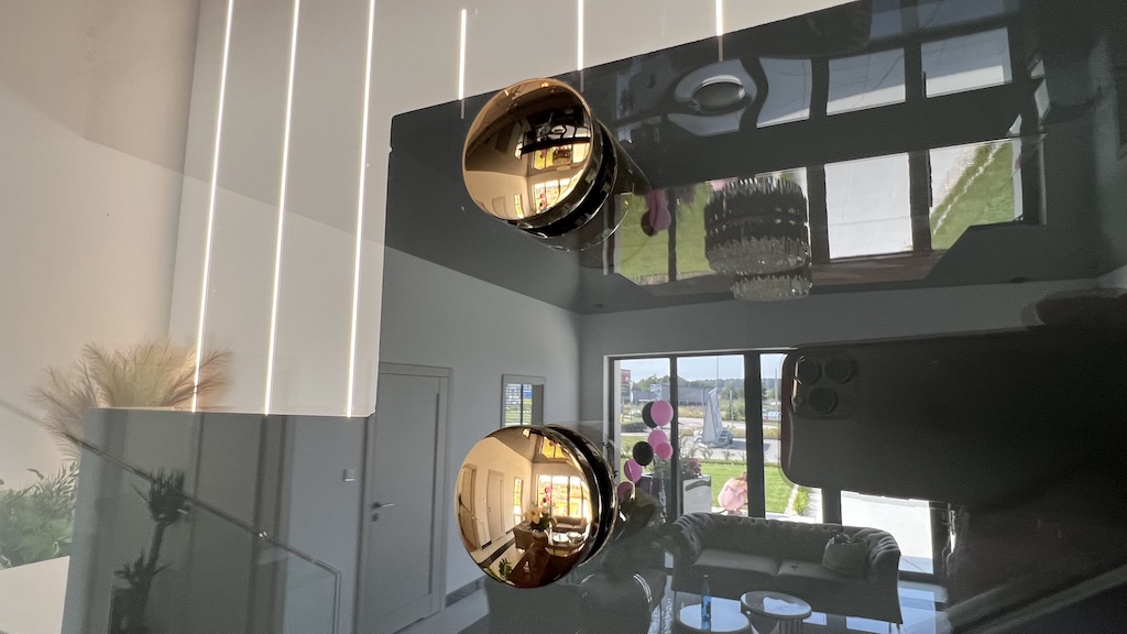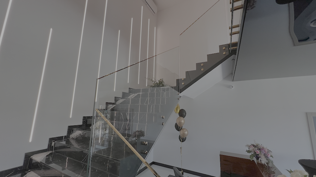 Całość poprzedziło wykonanie projektu technicznego dopasowanego do indywidualnych potrzeb inwestora, obejmującego pomiary, rysunki wykonawcze, dobór okuć i rozplanowanie połączeń tafli. Efektem jest nowoczesna balustrada szklana z punktowymi okuciami w kolorze złota, która idealnie współgra z czarnymi okładzinami, liniowym oświetleniem i detalami dekoracyjnymi, tworząc wyrazistą, a jednocześnie ponadczasową wizytówkę wnętrza kliniki.